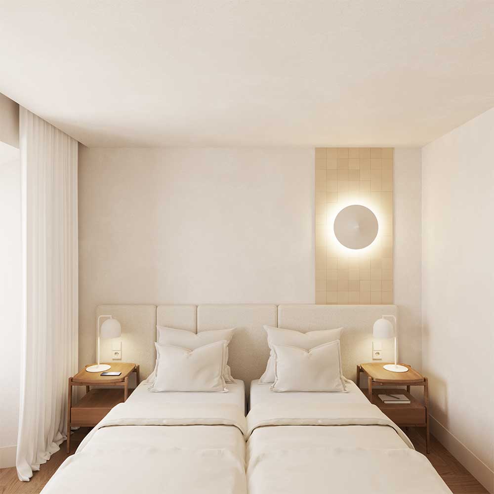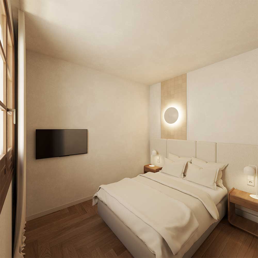 Habitación doble estándar con cama de matrimonio. Dispone de todos los servicios e instalaciones, baño completo con ducha, WIFI, A/A, calefacción, secador de pelo, espejo de aumento, TV LCD y caja fuerte.
